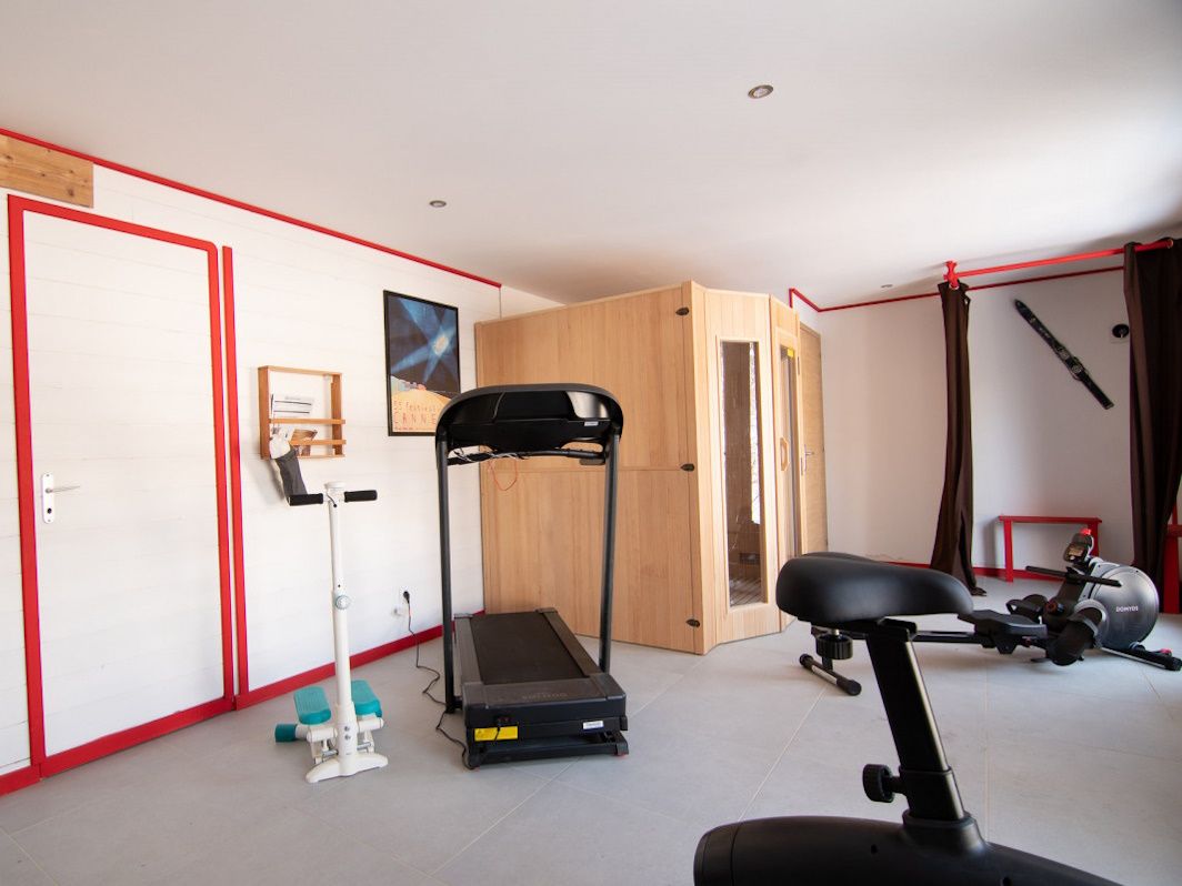 Verder beschikt het chalet over een ontspanningsruimte met sauna, fitnessapparatuur en een skiberging.