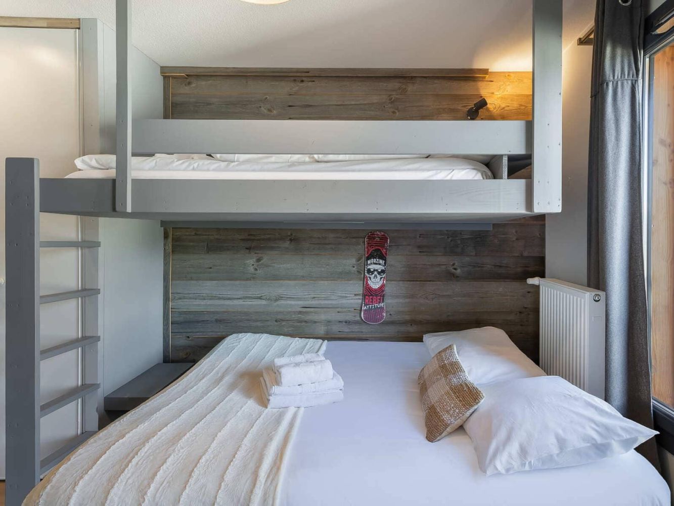 Eén slaapkamer met een 2-persoonsbed en en-suite badkamer met douche en toilet. Eén slaapkamer met een 1-persoonsbed met uitschuifbed. Eén slaapkamer met een 1-persoonsslaapbank en hoogslaper. Tussen deze laatste twee slaapkamers bevindt zich een schuifdeur. Wel heeft iedere kamer een eigen toegangsdeur. Aparte badkamer met bad en douche en toilet.