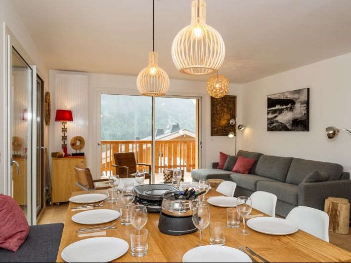 Sfeervolle woonkamer met een zithoek, eettafel en een open keuken met o.a. een inductiekookplaat, koelkast (met vriesgedeelte), oven, magnetron, vaatwasser, raclette, broodrooster, waterkoker, filterkoffiezetapparaat en Nespresso koffiezetapparaat. Verder beschikt dit appartement over een ruim terras op het zuidwesten, skiberging, wasmachine, droger, Bluetooth speaker en Wi-Fi.