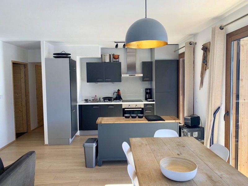 Sfeervolle woonkamer met een zithoek met televisie, Netflix, eettafel en een open keuken met o.a. een kookplaat, koelkast, oven, magnetron, vaatwasser, racletteset, fondueset, broodrooster, waterkoker en filterkoffiezetapparaat. Verder beschikt dit appartement over een ruim balkon op het zuidwesten, skiberging, wasdroogcombinatie, Bluetooth speaker en Wi-Fi.