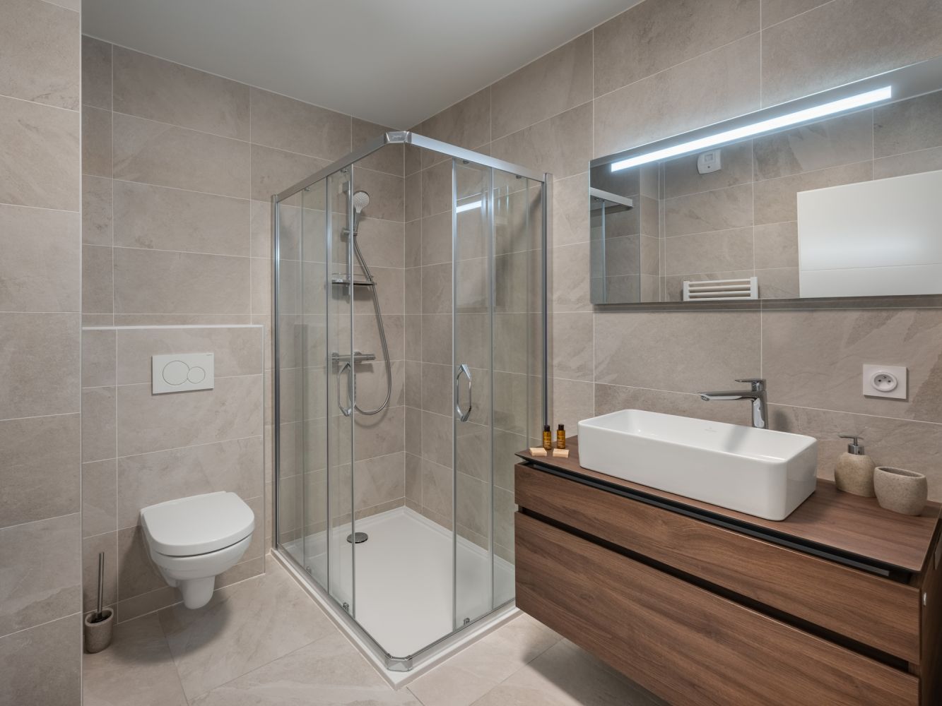 Drie slaapkamers, waarvan twee met ieder een 2-persoonsbed en en-suite badkamer met douche en toilet. Eén slaapkamer met twee 1-persoonsbedden (aan elkaar te schuiven als 2-persoonsbed). Badkamer met douche en toilet.