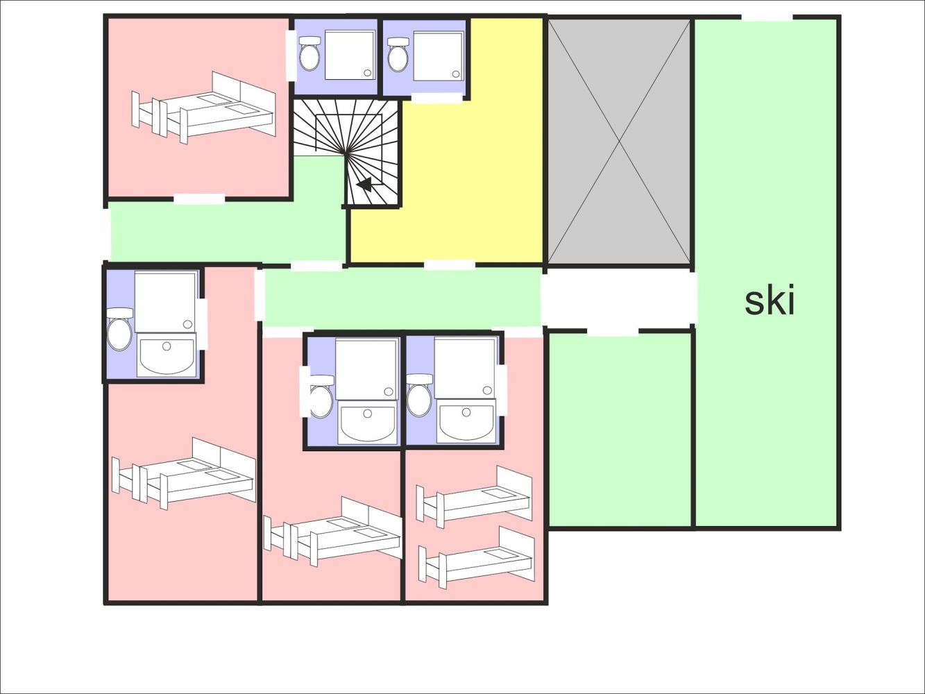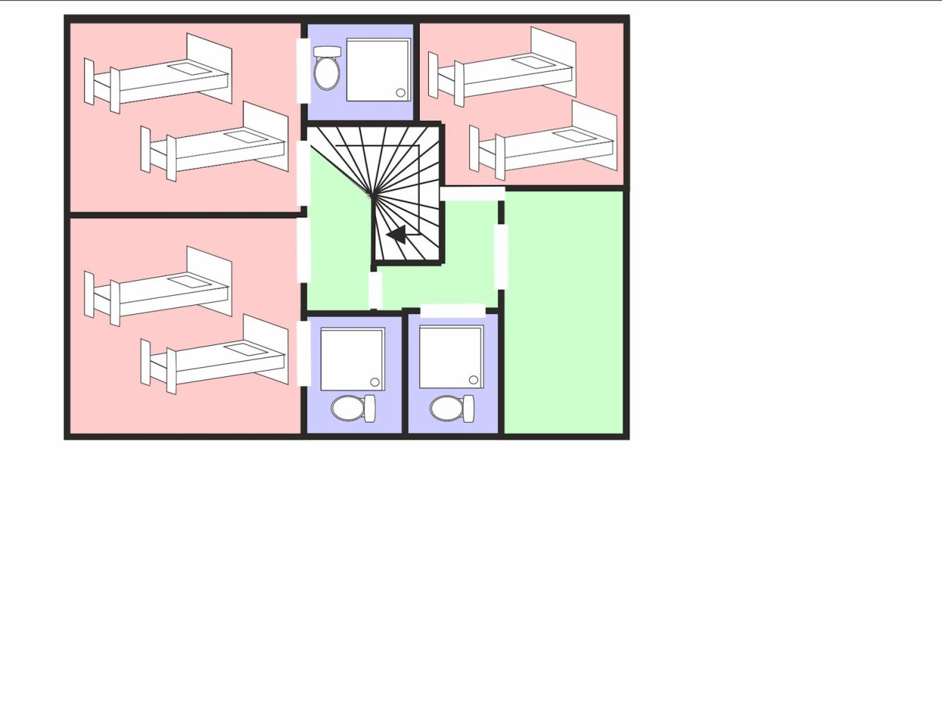 Op de tweede verdieping zijn drie slaapkamers met ieder twee 1-persoonsbedden en en-suite badkamer met douche en toilet. De kamers op deze verdieping hebben een schuin plafond met een lage balk, de stahoogte hier is ongeveer 1,75 m.
