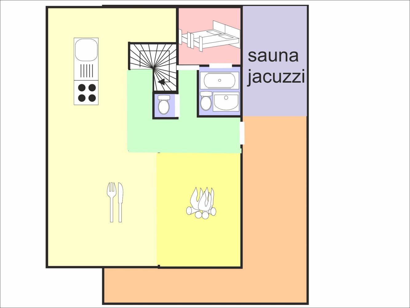 Op de eerste verdieping is de gezellige woonkamer met fijne zithoek, televisie, eettafel en een heerlijke openhaard die zorgt voor een warme en gezellige sfeer. Open keuken met o.a. een vijfpits gasfornuis, oven, magnetron, broodrooster, koelkast (met vriesvak), koffiezetapparaat en een vaatwasser. Via de woonkamer is er toegang tot het balkon, hier is de buiten whirlpool en de sauna te vinden. Slaapkamer met een 2-persoonsbed en en-suite badkamer met bubbelbad en toilet. Apart toilet.