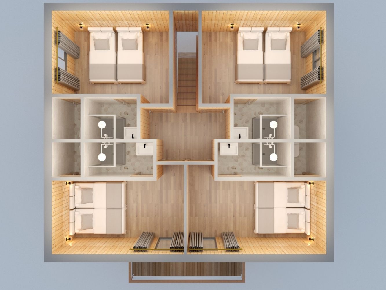 Zes slaapkamers met ieder twee 1-persoonsbedden (deze kunnen tegen elkaar aan geschoven worden), één slaapkamer met een 2-persoonsbed. Alle slaapkamers hebben een en-suite badkamer met douche en apart toilet.