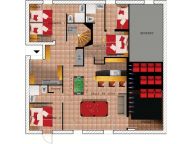Op de eerste verdieping bevindt zich een ruime woonkamer met grote ramen, een centrale open haard, zithoek met flatscreen-televisie, radio-CD speler en DVD-speler, eettafel en toegang tot een groot balkon met buiten-whirlpool en sauna! De keuken is uitgerust met o.a. een kookplaat, oven, magnetron, koelkast, vaatwasser, koffiezetapparaat, Nespresso-apparaat, waterkoker, racletteset, fondueset en een broodrooster. Verder beschikt dit chalet over een ruimte met pooltafel, tafelvoetbal en kleine bar, thuisbioscoop met 3D-scherm, Wii spelcomputer en tien bioscoopstoelen (films en games aanwezig), skiberging met skischoenendrogers, wasmachine en -droger en een internetverbinding (Wi-Fi).