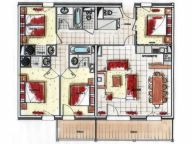 Vier slaapkamers, waarvan één met een 2-persoonsbed en drie met twee 1-persoonsbedden. Vier badkamers, waarvan één met bad, één met bad of douche en twee met douche. Twee toiletten.