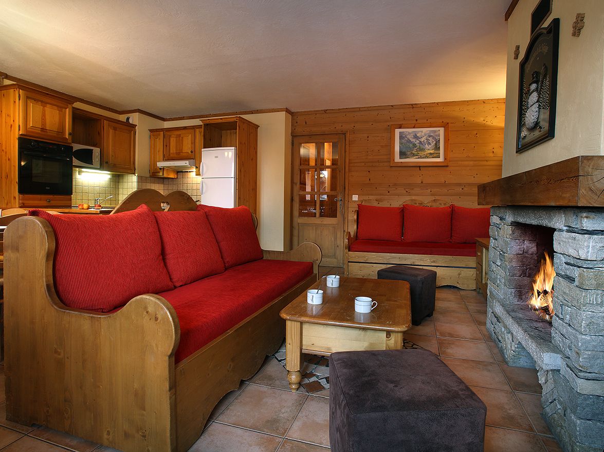 Sfeervolle woonkamer met fijne zithoek met 2-persoonsslaapbank, televisie, open haard en eetgedeelte. Netjes ingerichte open keuken voorzien van o.a. vier kookplaten, oven, magnetron, koffiezetapparaat (filter), waterkoker, koelkast en vaatwasser. Balkon met fantastisch uitzicht over de liften en pistes van Les Arcs.