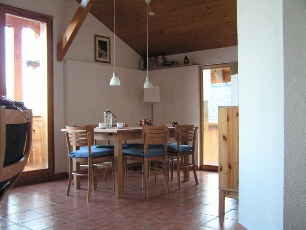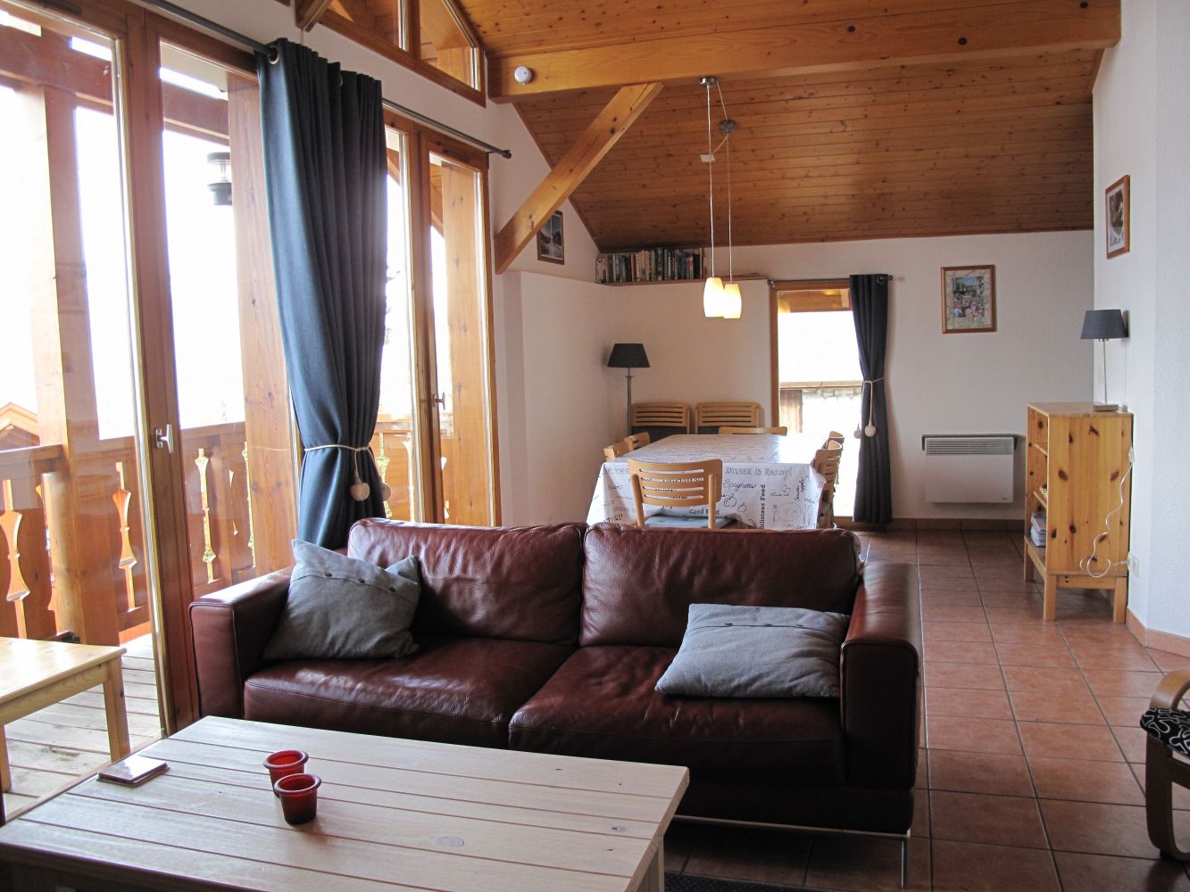 Entree met halletje, ruime gezellige woonkamer met eethoek, zithoek met 2-persoonsslaapbank, open haard en flatscreen-televisie beschikt over een satellietontvanger voor zowel Nederlandse als Franse zenders. Compleet ingerichte keuken met kookplaten, koelkast, vaatwasser, oven, magnetron, waterkoker en koffiezetapparaat. Balkon met een kilometers ver uitzicht over de Tarentaise vallei en op het tegenover gelegen Montchavin (La Plagne gebied).