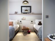 Twee slaapkamers, waarvan één met een 2-persoonsbed en één met twee 1-persoonsbedden. Eén slaaphoek (afsluitbaar d.m.v. gordijn) met twee 1-persoonsbedden. Twee badkamers met douche en toilet.