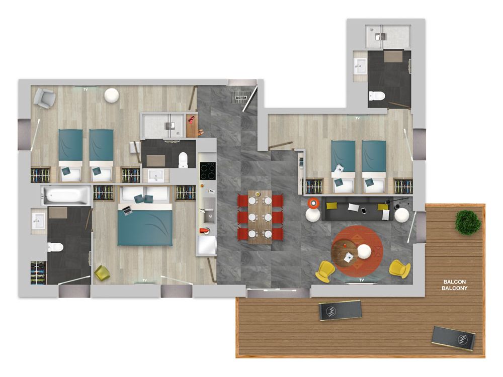 Drie slaapkamers met ieder twee 1-persoonsbedden en televisie. Drie badkamers, waarvan twee met douche, föhn en toilet en één met bad, föhn en toilet.