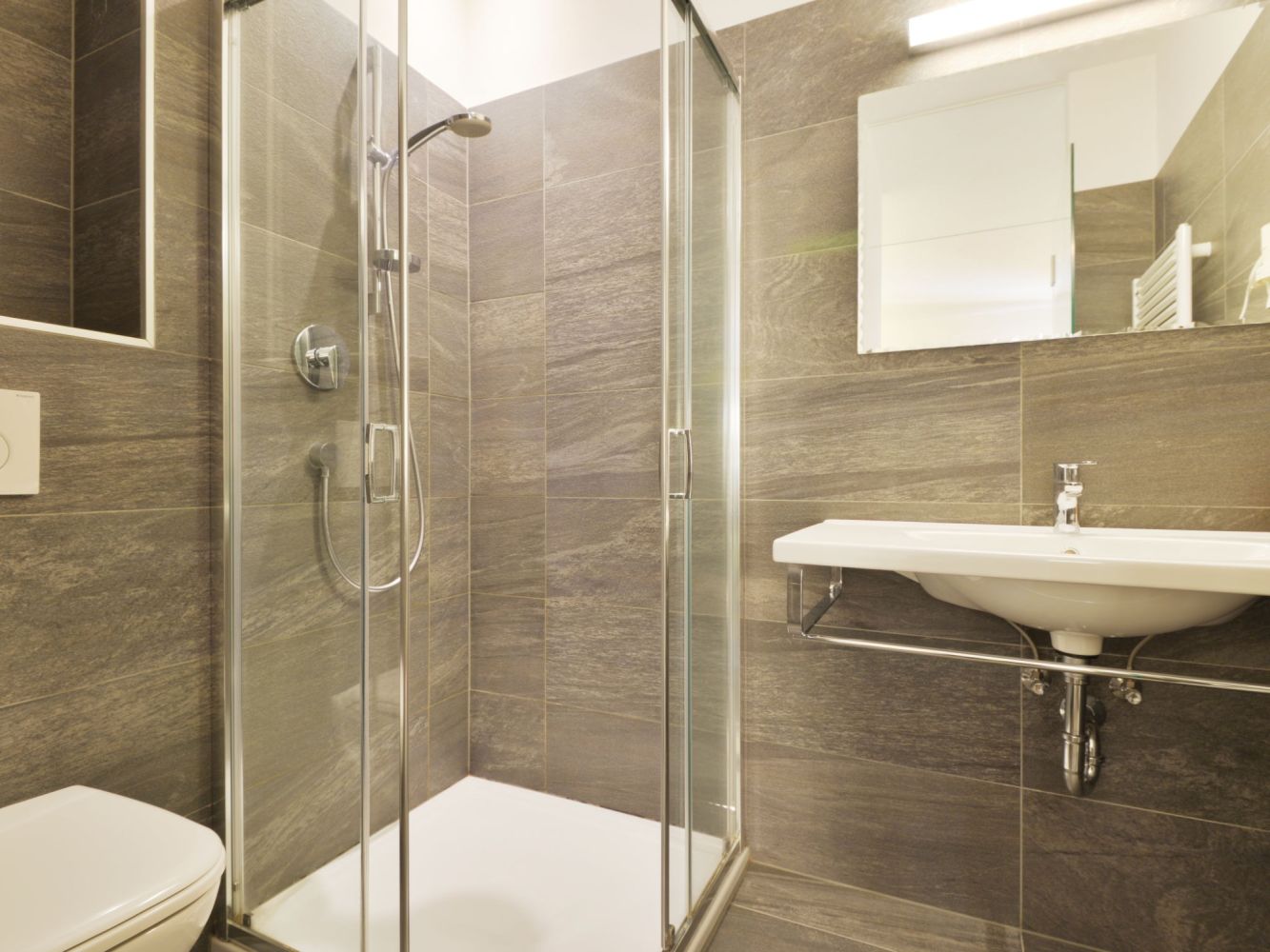 Er zijn drie slaapkamers met badkamer (bad of douche); 1 met 2-persoonsbed en 1-persoonsbed (80x190), 1 met 2-persoonsbed en 1 met twee aparte bedden.