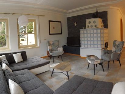In het appartement bevindt zich op de begane grond een ruime woonkamer (ca. 60 m²) met zithoek, televisie, eethoek en volledig ingerichte open keuken met o.a. een kookplaat, koelkast met vriesvak, oven, magnetron, vaatwasser, Nespresso koffiezetapparaat, waterkoker en broodrooster. Via een deur in de keuken kom je in de hal van het chalet. In het chalet bevindt zich op de begane grond een ruime woonkamer (ca. 100 m²) met zithoek, televisie, Oostenrijkse kachel, grote eethoek en volledig ingerichte open keuken met o.a. een kookplaat, koelkast met vriesvak, oven, magnetron, vaatwassser, Nespresso koffiezetapparaat, waterkoker en broodrooster. Verder is er een sauna ruimte met een douche en een apart toilet. Vanuit de woonkamer heb je toegang tot het terras (deels overdekt).