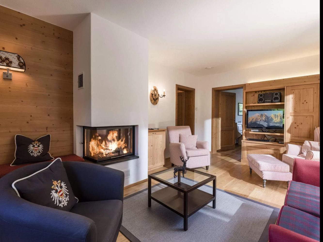 Comfortabele zithoek met slaapbank met televisie en open haard. Vanuit de woonkamer heb je toegang tot het balkon.