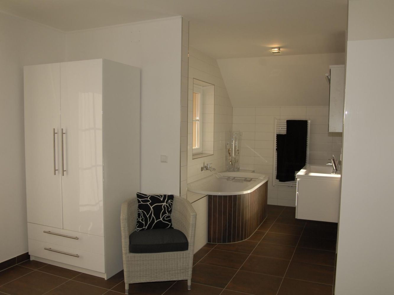 Op de eerste verdieping is één slaapkamer met een 2-persoonsbed. Badkamer met douche. Apart toilet.