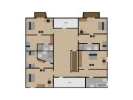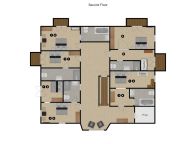 De tweede verdieping heeft vijf slaapkamers. Drie slaapkamers met ieder een 2-persoonsbed. Eén slaapkamer met een 2-persoonsbed en een 1-persoonsslaapbank. Eén slaapkamer met een 2-persoonsbed en twee 1-persoonsbedden (aan elkaar te schuiven). Vijf en-suite badkamers, waarvan twee met bad en toilet en drie met douche en toilet.