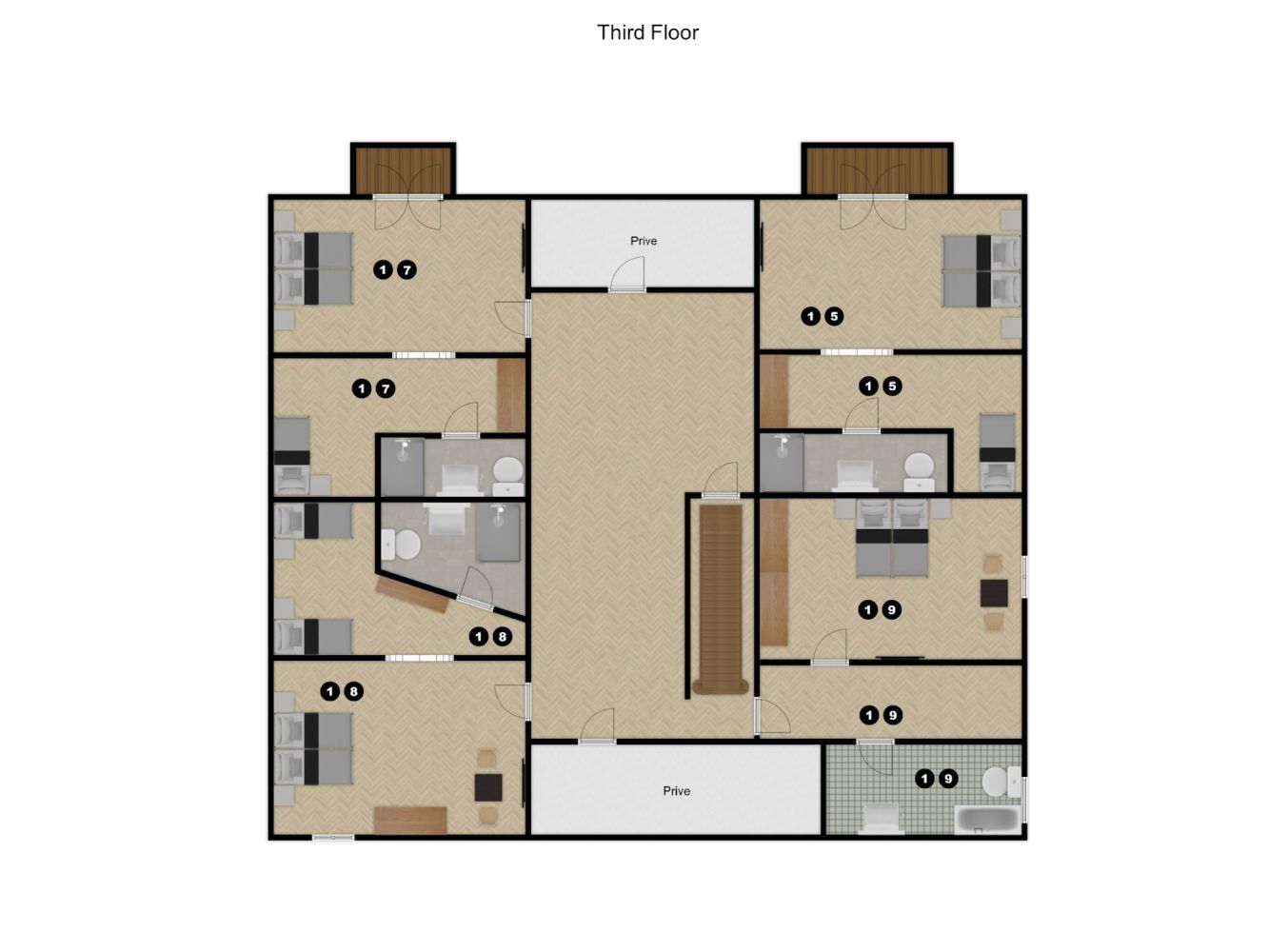 De derde verdieping heeft vier slaapkamers. Twee slaapkamers met een 2-persoonsbedden en een 1-persoonsbed. Eén slaapkamer met een 2-persoonbed. Eén slaapkamer met 2-persoonsbed en twee 1-persoonsbedden. Vier en-suite badkamers, waarvan één met bad en toilet en drie met douche en toilet.