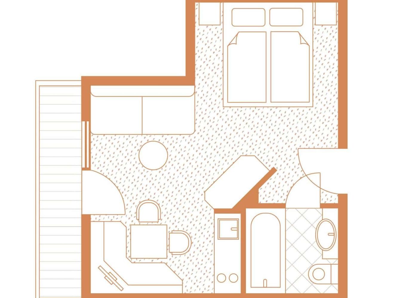 Het appartement bestaat uit een leef/slaap gedeelte met een 2-persoonsbed en een slaapbank, er is een badkamer met bad/douche en toilet.