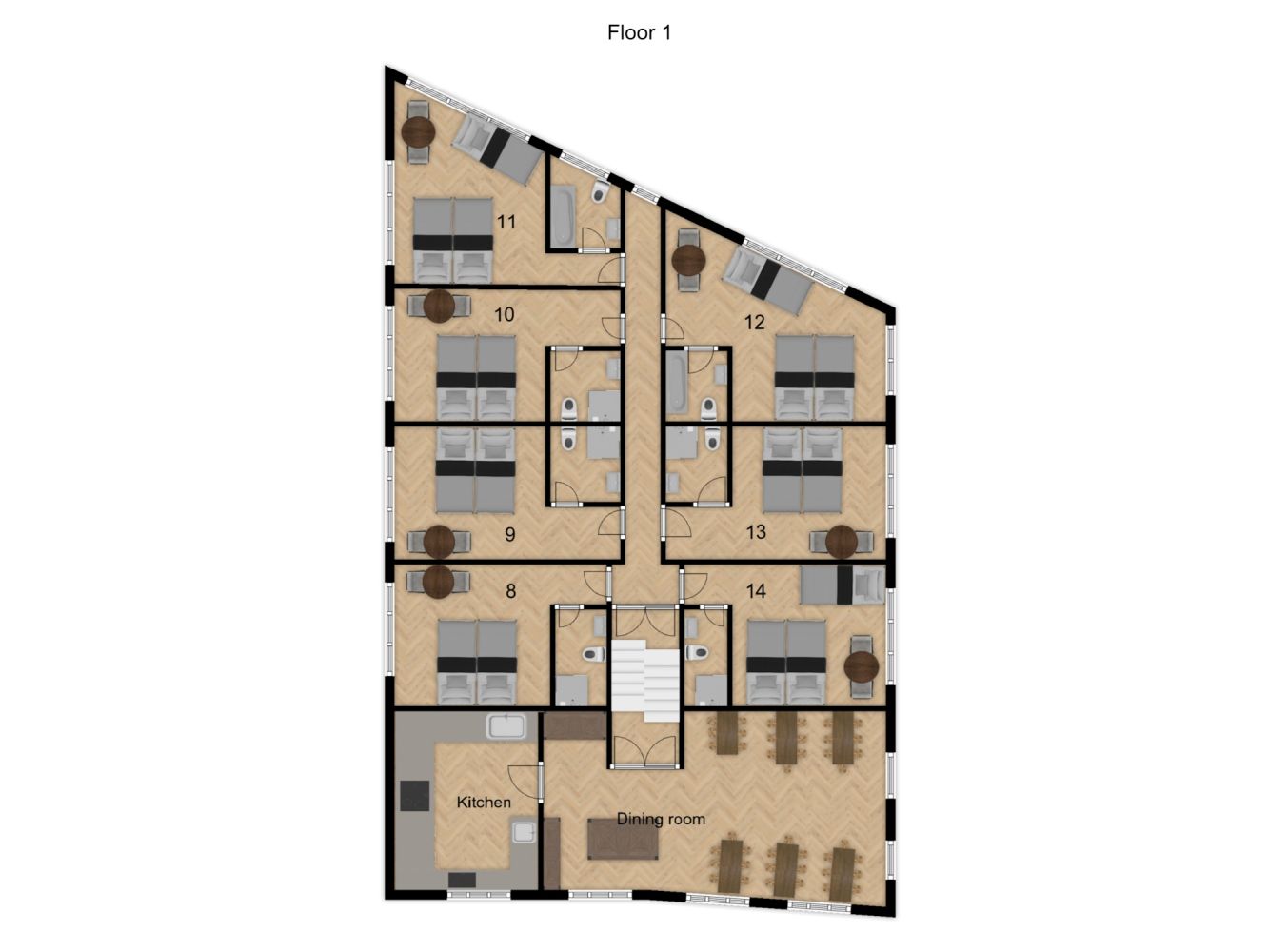 Op de eerste verdieping is de keuken en de eetkamer. Zeven slaapkamers, waarvan vier met een 2-persoonsbed en en-suite badkamer met douche en toilet. Twee slaapkamers met een 2-persoonsbed, een 1-persoonsbed en en-suite badkamer met bad en toilet. Eén slaapkamer met een 2-persoonsbed, een 1-persoonsbed en en-suite badkamer met douche en toilet.