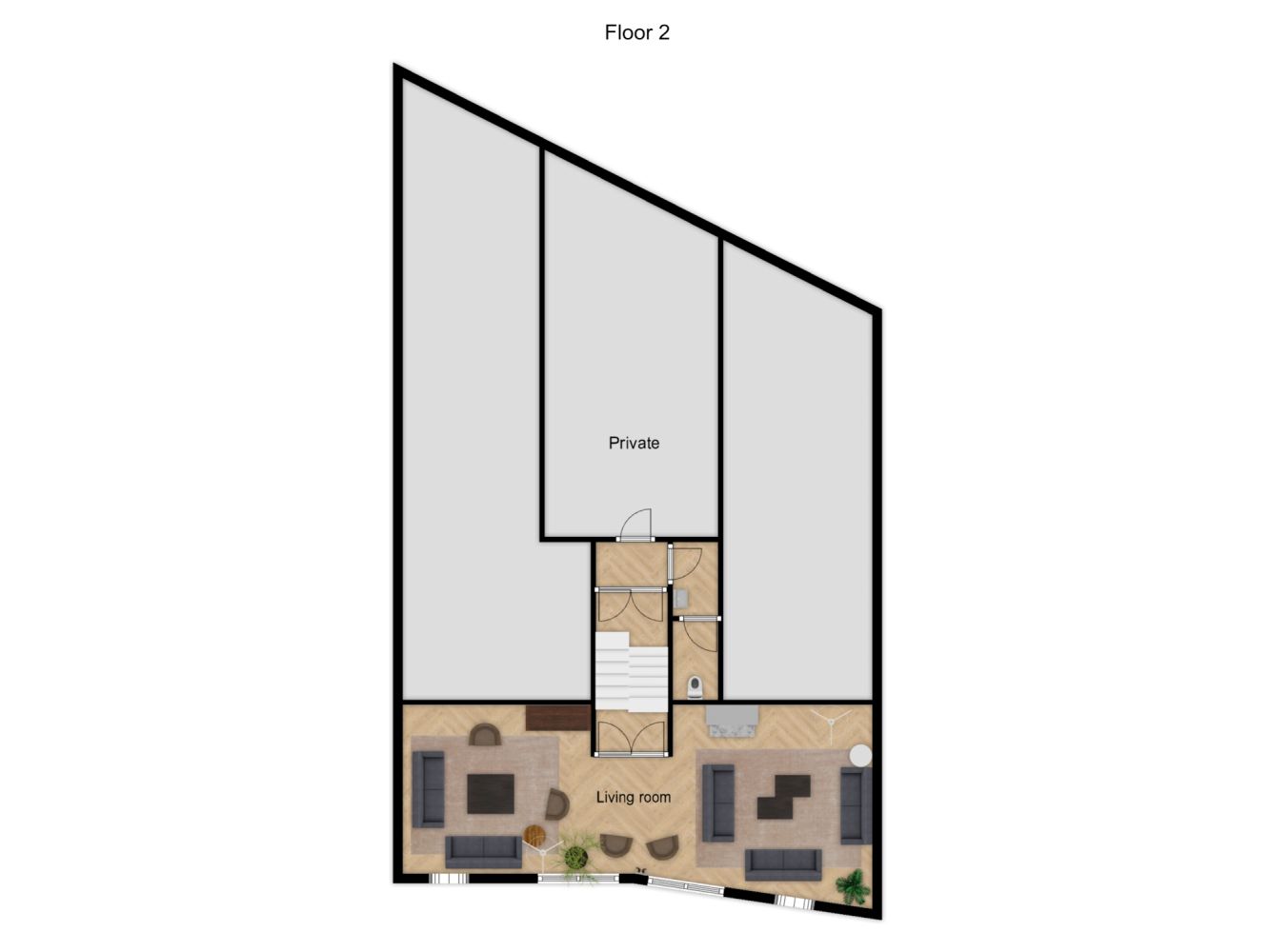 Op de tweede verdieping is een grote gezellige woonkamer met zithoek en een openhaard. Apart toilet.