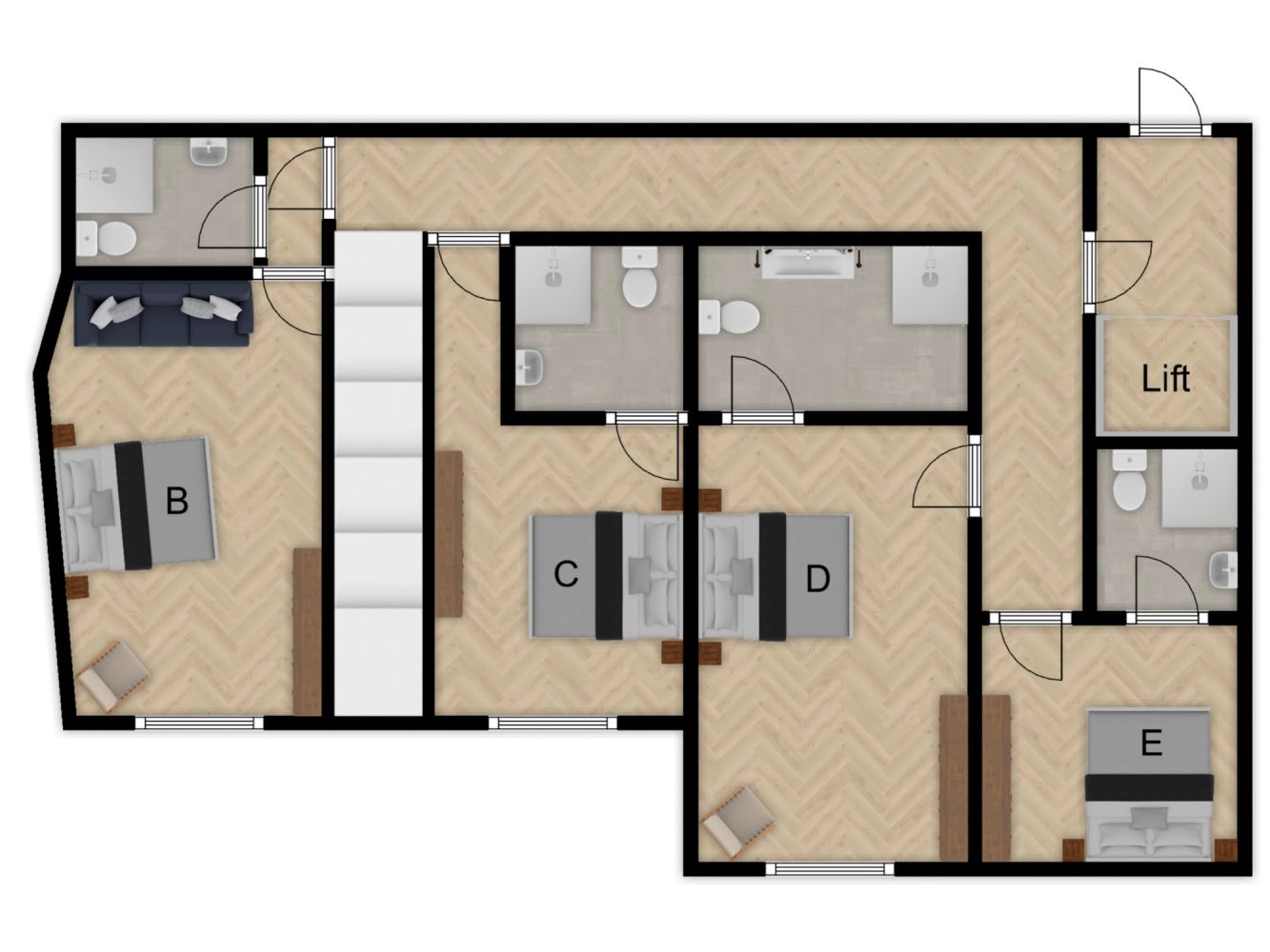 Vijf 2-persoons slaapkamers, met ieder een en-suite badkamer met inloopdouche en toilet.