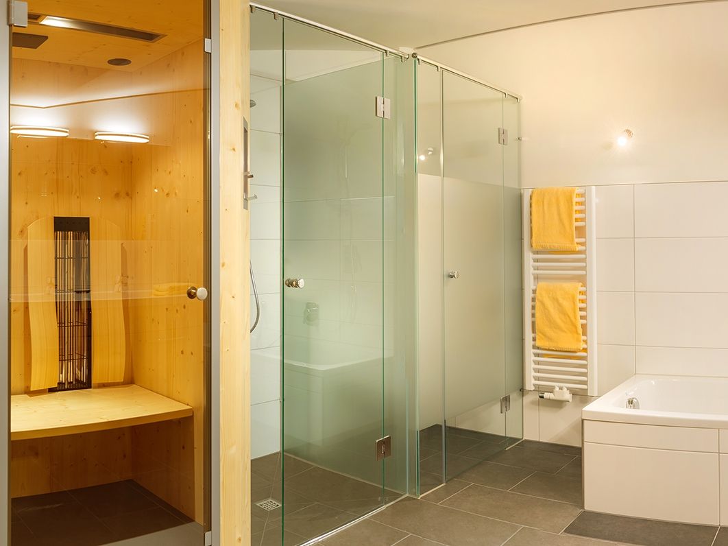 Vier slaapkamers met ieder een 2-persoonsbed en televisie. Vier badkamers waarvan twee met douche en toilet en twee met bad en toilet. Verder is er een privé-infraroodcabine.