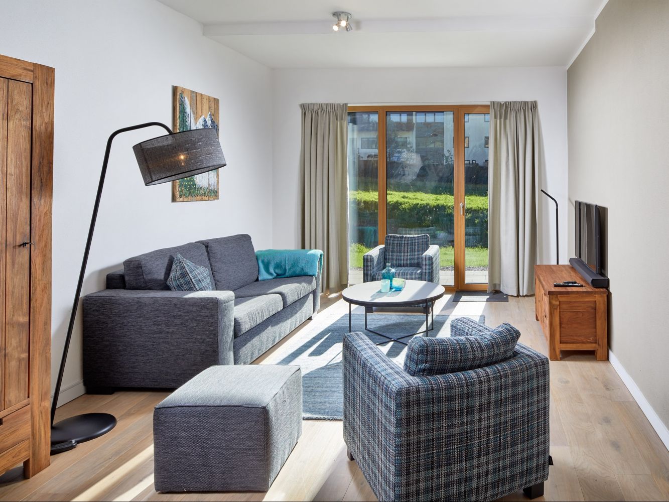 Woonkamer met een zithoek, televisie, Bluetooth Soundbar en een eethoek. Volledig ingerichte keuken met o.a. een 4-pits kookplaat, oven, magnetron, koelkast, vaatwasser, waterkoker en koffiezetapparaat (filter). Verder is er een ruim terras op het zuiden en er is gratis Wi-Fi.