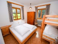 Woonkamer met typisch Oostenrijkse zithoek en televisie. Keuken met eethoek voorzien van kookplaat, oven, koelkast, koffiezetapparaat en vaatwasser.