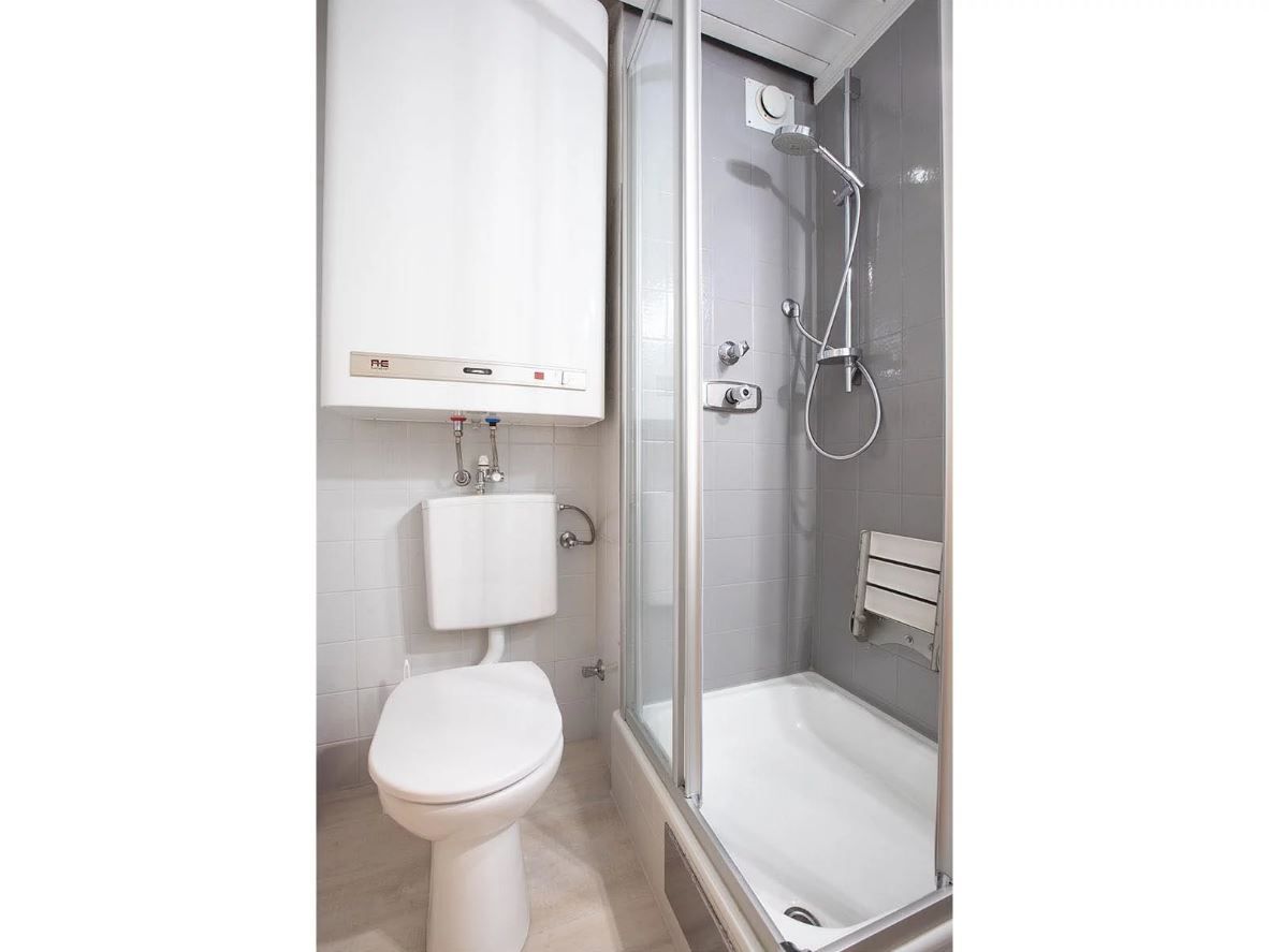 Slaaphoek in de woonkamer met een 3-persoonsstapelbed (een 2-persoonsbed en daarboven een 1-persoonshoogslaper). Badkamer met douche en toilet.