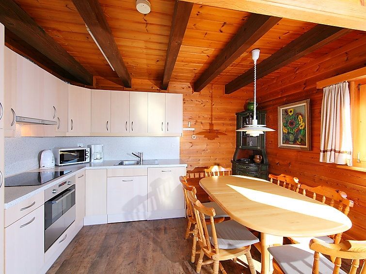 Gezellige woonkamer met een zithoek, televisie (alleen Zwitserse zenders), DVD-speler, eettafel en een open keuken uitgerust met o.a. een kookplaat, koelkast, oven, combi-magnetron, fondueset en vaatwasser. Verder beschikt dit chalet over een Wi-Fi internetverbinding en terras.